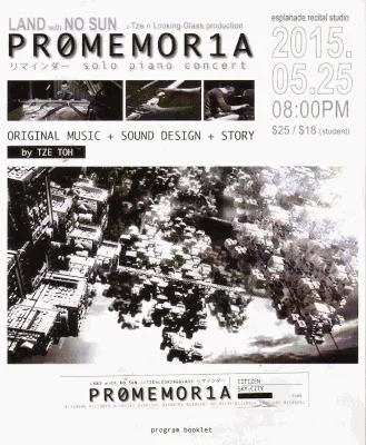 Promemoria was the sequel to Tze's first concert and took the form of a solo piano recital aided by pre-recorded tracks (referred to as sound design) and two violinists, Christina Zhou and Gabriel Lee. For those unfamiliar with his work, Tze is a largely self-taught and extraordinary musician whose idiom straddles comfortable between genres of classical, jazz, world and film music. His eclecticism is not applied in a haphazard or cut-and-paste manner, but through well thought-out and seamless musical scenarios.